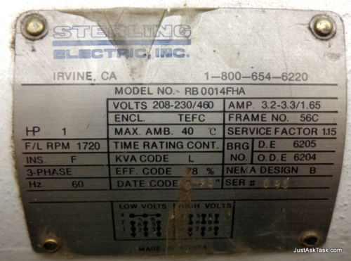 STERLING ELECTRIC SB0014PCA 1HP Stainless Steel C-Face Footless Motor WASHDOWN