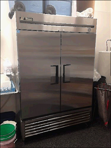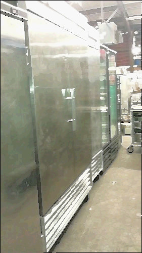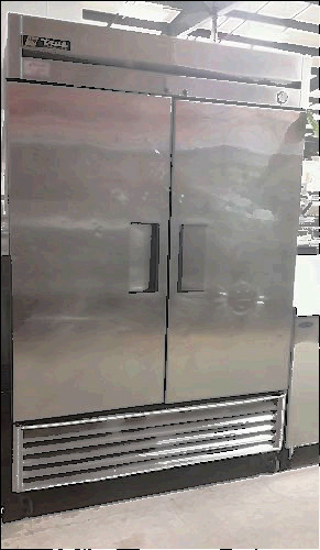 True T-49F T-Series Commercial Kitchen Stainless 2 Door Freezer Unit has been tested and works perfectly. It needs to be cleaned and has exterior wear, but overall this is a good, working piece and gets the job done. This one features interior shelving and wheels for easy transport.