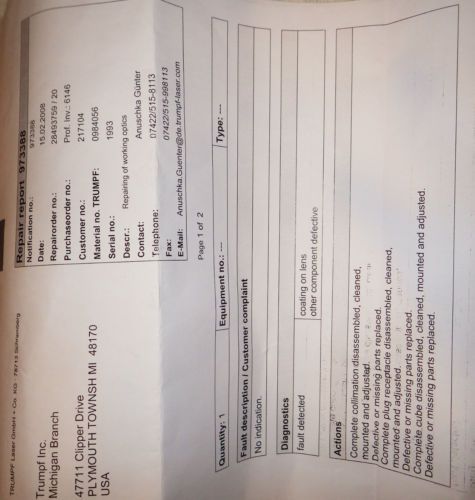 | Seller Notes | “This is a TRUMPF Laser Cutting head for a Muti-Killowatt system. It has several Material ID's: 0766637 / 0766601 / 0984056 / 22-24-11-00/08. It has been totally rebuild by TRUMPF directly and has never been installed on a machine. Includes paperwork from TRUMPF detailing the rebuild, as well as the engineering drawing. All parts used were NEW, lens's and gas feed lines included. This is defiantly the nicest one you will find to bring your machine back into spec. I have never seen this model cutting head for sale anywhere.” |