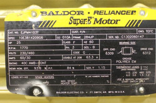 Baldor Super E Motor Hp 60 Frame 364TS Model P36G0374D 230/460V Used 60 day wnty