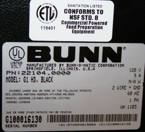 used BUNN Commercial Gourmet Coffee Bean Grinder Model G2 HD Black