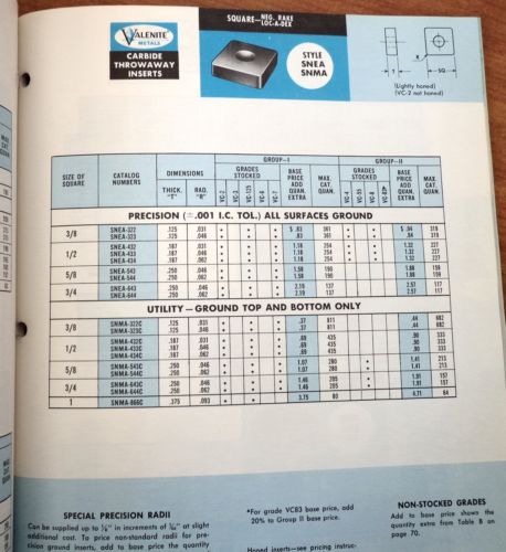 Seller Notes | “Very Good Condition. October 1, 1967. Valenite Metals., 74 pages. 12 oz. (11 x 8.5 x .2 inches Stapled 3-ring hole punch Paperback) Very Good Condition. light edge/cover wear, Text is Clean and Unmarked! Binding is Tight! Next day Shipping with tracking! Valenite Metals Carbide Throwaway Inserts and Brazed Tools and Blanks Catalog CTB-104 10-1-67” |