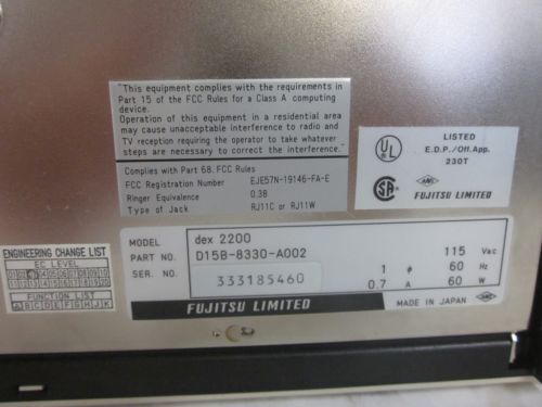 | Seller Notes | “This vintage Fujitsu dex 2200 fax machine is in great cosmetic condition considering its age. It powers on a feeds paper without a problem. It does have a little yellowing. This is an 80's vintage and is a great piece for the right collector.” |