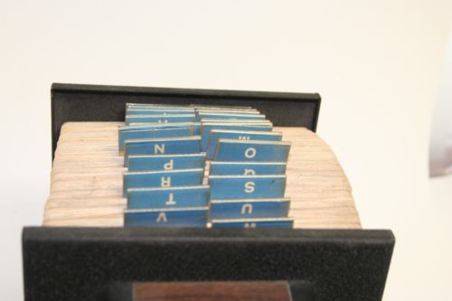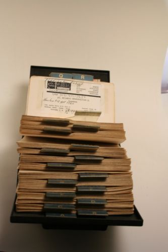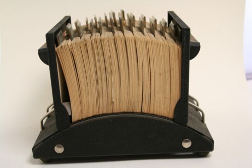| “Cards have yellowing from age. Some have business cards on them. Some cosmetic wear to Rolodex.” |