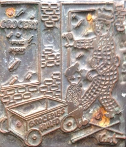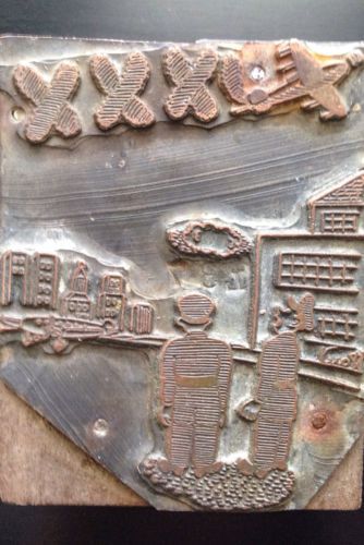 VTG PRINTERS STAMP BLOCK 1930? COPPER WOOD FIREPLACE ? BOY FISHING IN FISH TANK?