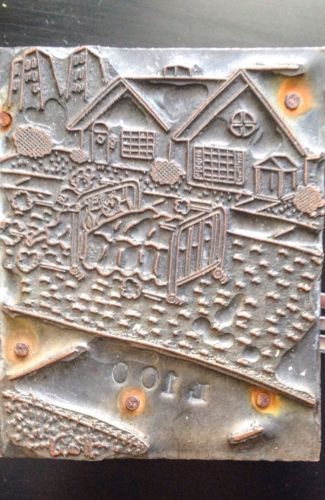 LG PRINTERS STAMP BLOCK 1930? ANTIQUE METAL W COPPER COVERED BRIDGE 9" X 9" ART