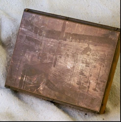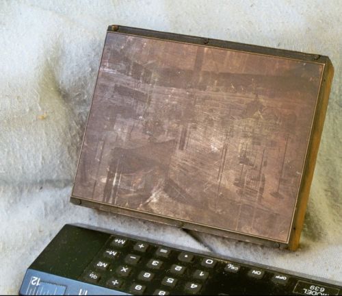 LG PRINTERS STAMP BLOCK 1930? ANTIQUE METAL W COPPER COVERED BRIDGE 9" X 9" ART