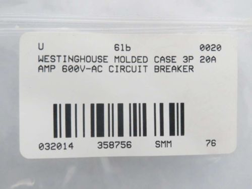 WESTINGHOUSE MOLDED CASE 3P 20A AMP 600V-AC CIRCUIT BREAKER B358744